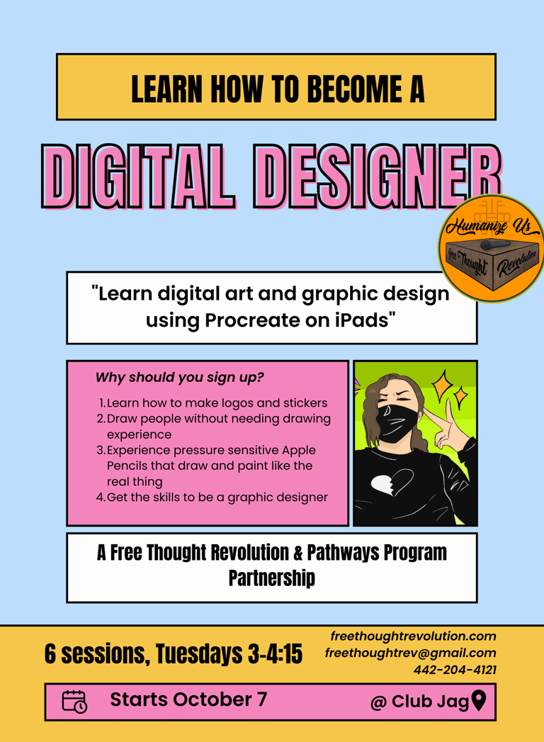 Digital Designers is a graphic design program created to introduce students to the medium of digital art. Students will become proficient in the basic features of the Procreate program while engaging in guided art projects on iPads using pressure-sensitive Apple Pencils. The final project will ask students to create a personal piece of digital art with a meaningful message. No prior drawing skills necessary!